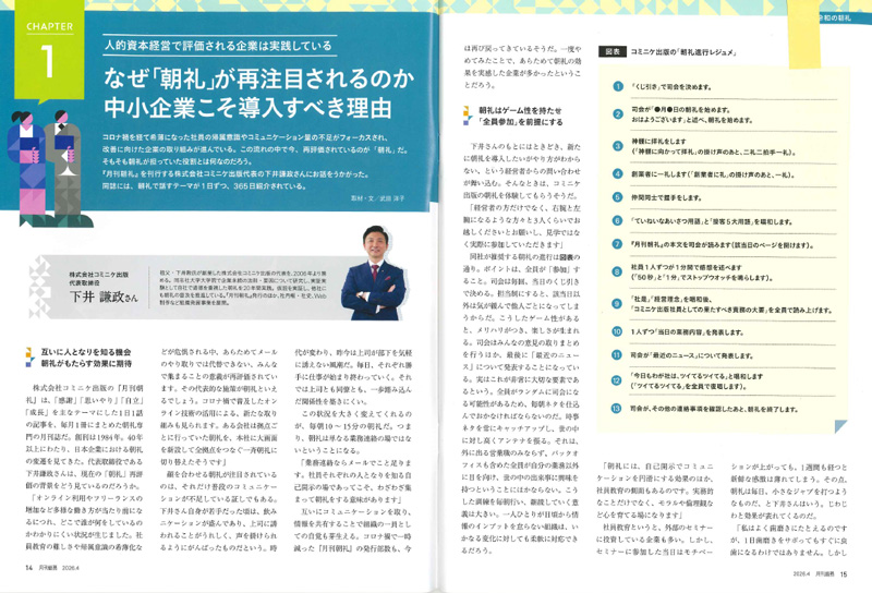4月号の特集「令和の朝礼」に、コミニケ出版社長 下井謙政のインタビューが掲載されています。
